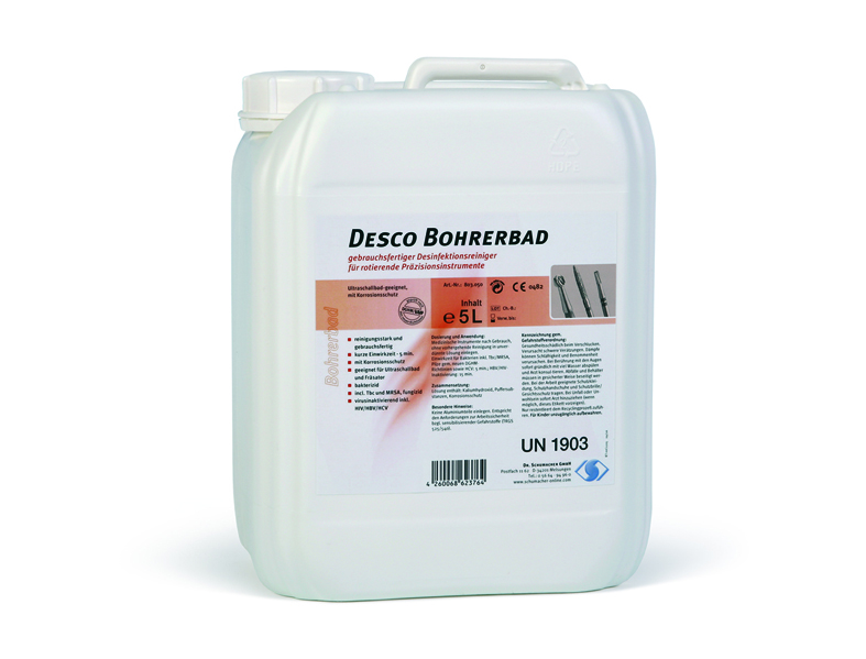 DESCO BOHRERBAD комбинированный припарат для дезинфекции и очистки вращающихся инструментов используемых в зубоврачебной практике. В основе гидроокись калия, ингибиторы коррозии и растворители. Биологически разрушается. Бактерицидный, фунгицидный, антибактериальные свойства достигаются через 5 минут.